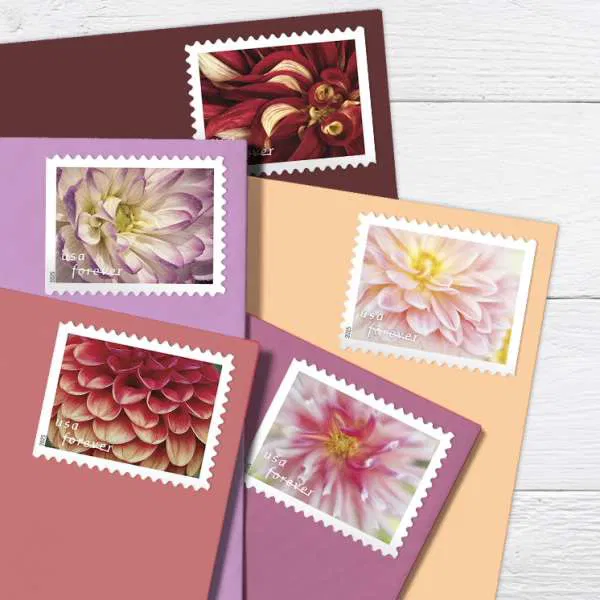 The Dahlias stamps are being issued as Forever® stamps in booklets of 20 and in coils of 3,000 and 10,000. These Forever stamps will